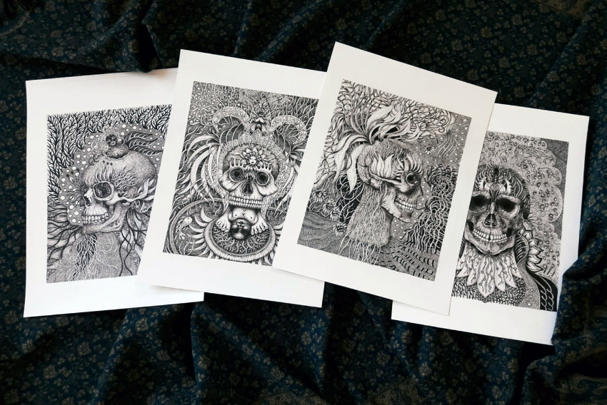 2. De profil, la mort déesse, reine des fleurs. Ses yeux sont des algues, des pétales ; de son crâne jaillit une exubérante nature. La mort, décomposée, favorise la vie. En prenant du recul, en élargissant notre point de vue, il est possible de comprendre que ce cycle intelligent ne devrait pas nous effrayer. On le perçoit ici, on touche du doigt ce grand mystère : la mort et la vie dansent un même ballet. Tout se rejoint dans le cycle cosmique, tout se régénère, dans un merveilleux équilibre. La beauté du dessin et la pureté de l’intention qui l’ont fait naître font mouche. C’est un dessin qui jaillit de la source de l’être, qui nous parle parce qu’il nous raconte – tous.